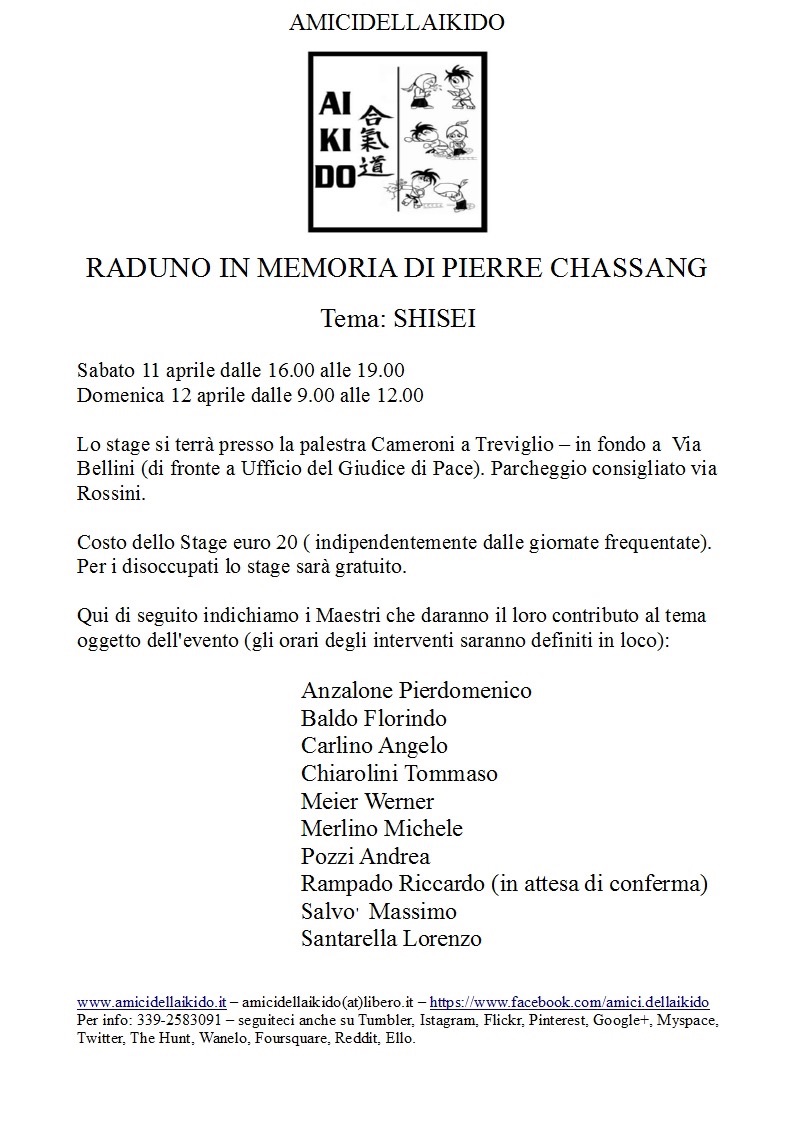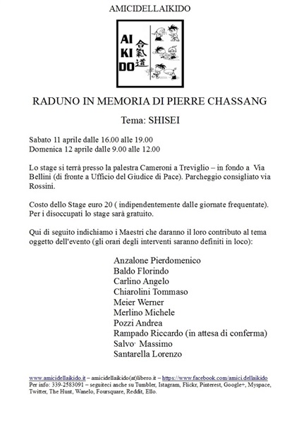 Primo raduno nella "bassa" bergamasca in memoria di Pierre Chassang pioniere dell'aikido in Europa e fondatore della Federazione internazionale d'aikido e di quella europea ( e di numerose altre come da ultimo Takemusu Aiki )